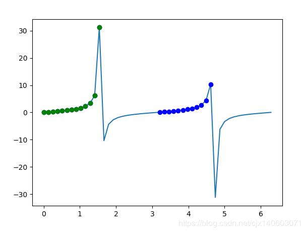 import matplotlib.pyplot as plt import numpy as np a = np.linspace(0, 2 * np.pi, 50) b = np.tan(a) plt.plot(a,b) #生成一个正切函数图 mask = b >= 0 plt.plot(a[mask], b[mask], 'bo') #符合条件的标注蓝色圆点 mask = (b >= 0) & (a <= np.pi / 2) plt.plot(a[mask], b[mask], 'go') #符合条件的标注绿色圆点 plt.show()