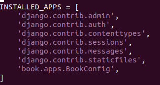 INSTALLED_APPS = [ 'django.contrib.admin', 'django.contrib.auth', 'django.contrib.contenttypes', 'django.contrib.sessions', 'django.contrib.messages', 'django.contrib.staticfiles', 'book.apps.BookConfig', ]