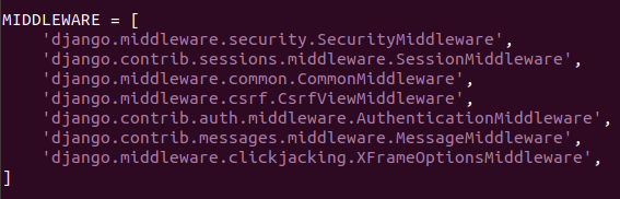 MIDDLEWARE = [ 'django.middleware.security.SecurityMiddleware', 'django.contrib.sessions.middleware.SessionMiddleware', 'django.middleware.common.CommonMiddleware', 'django.middleware.csrf.CsrfViewMiddleware', 'django.contrib.auth.middleware.AuthenticationMiddleware', 'django.contrib.messages.middleware.MessageMiddleware', 'django.middleware.clickjacking.XFrameOptionsMiddleware', ]