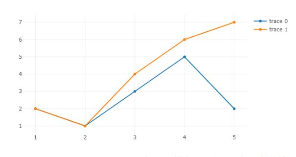 #plotly折线图,trace就代表折现的条数 trace1=go.Scatter(x=df['Attack'],y=df['Defense']) trace1=go.Scatter(x=[1,2,3,4,5],y=[2,1,3,5,2]) trace2=go.Scatter(x=[1,2,3,4,5],y=[2,1,4,6,7]) py.iplot([trace1,trace2])