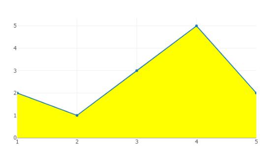 #填充区域 trace1=go.Scatter(x=[1,2,3,4,5],y=[2,1,3,5,2],fill="tonexty",fillcolor="#FF0") py.iplot([trace1])