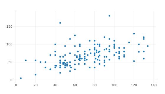 # 散点图 trace1=go.Scatter(x=[1,2,3,4,5],y=[2,1,3,5,2],mode='markers') trace1=go.Scatter(x=df['Attack'],y=df['Defense'],mode='markers') py.iplot([trace1],filename='basic-scatter')