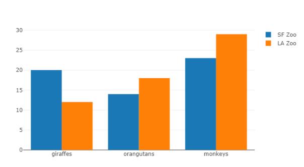 #组合bar group trace1 = go.Bar(x=['giraffes', 'orangutans', 'monkeys'],y=[20, 14, 23],name='SF Zoo') trace2 = go.Bar(x=['giraffes', 'orangutans', 'monkeys'],y=[12, 18, 29],name='LA Zoo') data = [trace1, trace2] layout = go.Layout( barmode='group') fig = go.Figure(data=data, layout=layout) py.iplot(fig, filename='grouped-bar')