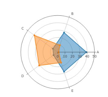 # Learn about API authentication here: https://plot.ly/pandas/getting-started # Find your api_key here: https://plot.ly/settings/api #雷达图 data = [ go.Scatterpolar( r = [39, 28, 8, 7, 28, 39], theta = ['A','B','C', 'D', 'E', 'A'], fill = 'toself', name = 'Group A' ), go.Scatterpolar( r = [1.5, 10, 39, 31, 15, 1.5], theta = ['A','B','C', 'D', 'E', 'A'], fill = 'toself', name = 'Group B' ) ] layout = go.Layout( polar = dict( radialaxis = dict( visible = True, range = [0, 50] ) ), showlegend = False ) fig = go.Figure(data=data, layout=layout) py.iplot(fig, filename = "radar/multiple")