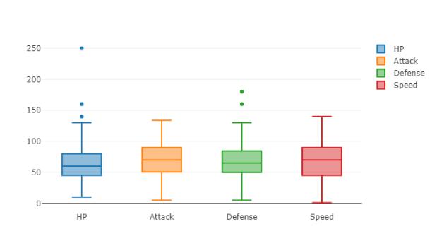 #box 箱子图 df_box=df[['HP','Attack','Defense','Speed']] data = [] for col in df_box.columns: data.append(go.Box(y=df_box[col], name=col, showlegend=True ) ) #data.append( go.Scatter(x= df_box.columns, y=df.mean(), mode='lines', name='mean' ) ) py.iplot(data, filename='pandas-box-plot')