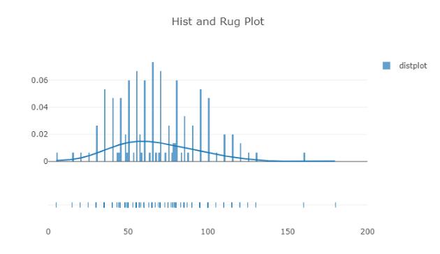 #distplot import plotly.figure_factory as ff hist_data =[df['Defense']] group_labels = ['distplot'] fig = ff.create_distplot(hist_data, group_labels) # Add title fig['layout'].update(title='Hist and Rug Plot',xaxis=dict(range=[0,200])) py.iplot(fig, filename='Basic Distplot')