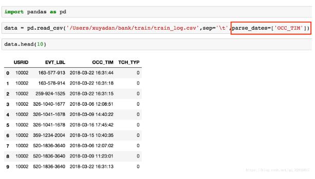 import time data['timestamp'] = data['OCC_TIM'].apply(lambda x:time.mktime(x.timetuple())) # 所以最重要的是 日期.timetuple() 这个用法 通过它将日期转换成时间元组 data.head(10) # 输出: