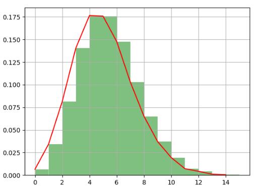 # Poisson分布 x = np.random.poisson(lam=5, size=10000) # lam为λ size为k pillar = 15 a = plt.hist(x, bins=pillar, normed=True, range=[0, pillar], color='g', alpha=0.5) plt.plot(a[1][0:pillar], a[0], 'r') plt.grid() plt.show()