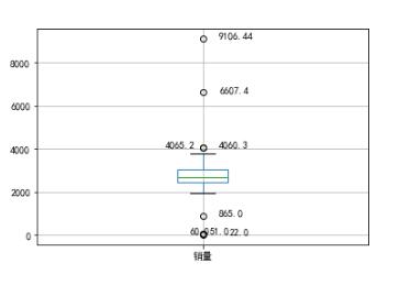 #-*- coding: utf-8 -*- import pandas as pd catering_sale = '../data/catering_sale.xls' #餐饮数据 data = pd.read_excel(catering_sale, index_col = u'日期') #读取数据,指定“日期”列为索引列 import matplotlib.pyplot as plt #导入图像库 plt.rcParams['font.sans-serif'] = ['SimHei'] #用来正常显示中文标签 plt.rcParams['axes.unicode_minus'] = False #用来正常显示负号 plt.figure() #建立图像 p = data.boxplot(return_type='dict') #画箱线图,直接使用DataFrame的方法 x = p['fliers'][0].get_xdata() # 'fliers'即为离群点的标签 y = p['fliers'][0].get_ydata() y.sort() #从小到大排序,该方法直接改变原对象 #用annotate添加注释 #其中有些相近的点,注解会出现重叠,难以看清,需要一些技巧来控制。 #以下参数都是经过调试的,需要具体问题具体调试。 for i in range(len(x)): if i > 0: plt.annotate(y[i], xy = (x[i],y[i]), xytext=(x[i]+0.05 -0.8/(y[i]-y[i-1]),y[i])) else: plt.annotate(y[i], xy = (x[i],y[i]), xytext=(x[i]+0.08,y[i])) plt.show() #展示箱线图