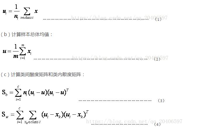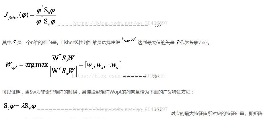 (d)LDA作为一个分类的算法,我们希望类内的聚合度高,即类内散度矩阵小,而类间散度矩阵大。这样的分类效果才好。因此引入Fisher鉴别准则表达式: