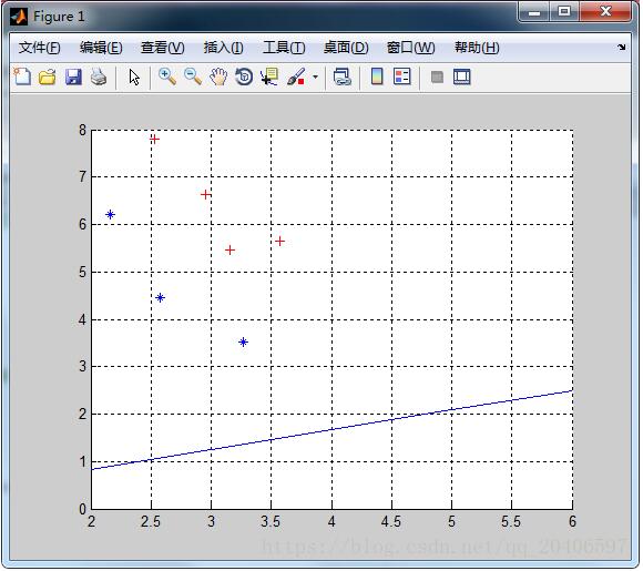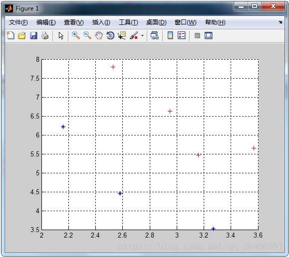 %计算第一类样本在直线上的投影点 xi=[]; for i=1:p y0=X1(i,2); x0=X1(i,1); x1=(k*(y0-b)+x0)/(k^2+1); xi=[xi;x1]; end yi=k*xi+b; XX1=[xi yi]; %计算第二类样本在直线上的投影点 xj=[]; for i=1:q y0=X2(i,2); x0=X2(i,1); x1=(k*(y0-b)+x0)/(k^2+1); xj=[xj;x1]; end yj=k*xj+b; XX2=[xj yj]; % y=W'*[X1;X2]'; plot(XX1(:,1),XX1(:,2),'r+','markerfacecolor', [ 1, 0, 0 ]); plot(XX2(:,1),XX2(:,2),'b*','markerfacecolor', [ 0, 0, 1 ]);