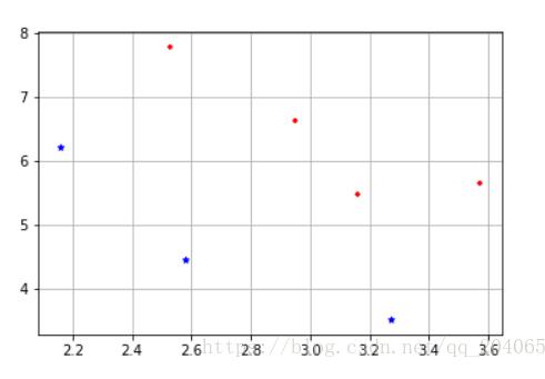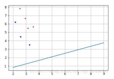 #第一步,求各个类别的均值 M1=np.mean(X1,0) M1=np.array([M1]) print(M1,M1.shape) M2=np.mean(X2,0) M2=np.array([M2]) print(M2) M=np.mean(X[:,0:2],0) M=np.array([M]) print(M) p=np.size(X1,0) print(p) q=np.size(X2,0) print(q) #第二步,求类内散度矩阵 S1=np.dot((X1-M1).transpose(),(X1-M1)) print(S1) S2=np.dot((X2-M2).transpose(),(X2-M2)) print(S2) Sw=(p*S1+q*S2)/(p+q) print(Sw) #第三步,求类间散度矩阵 Sb1=np.dot((M1-M).transpose(),(M1-M)) print(Sb1) Sb2=np.dot((M2-M).transpose(),(M2-M)) print(Sb2) Sb=(p*Sb1+q*Sb2)/(p+q) print(Sb) #判断Sw是否可逆 bb=np.linalg.det(Sw) print(bb) #第四步,求最大特征值和特征向量 [V,L]=np.linalg.eig(np.dot(np.linalg.inv(Sw),Sb)) print(V,L.shape) list1=[] a=V list1.extend(a) print(list1) b=list1.index(max(list1)) print(a[b]) W=L[:,b] print(W,W.shape) #根据求得的投影向量W画出投影线 k=W[1]/W[0] b=0; x=np.arange(2,10) yy=k*x+b plt.plot(x,yy) plt.scatter(X1[:,0],X1[:,1],marker='+',color='r',s=20) plt.scatter(X2[:,0],X2[:,1],marker='*',color='b',s=20) plt.grid() plt.show()