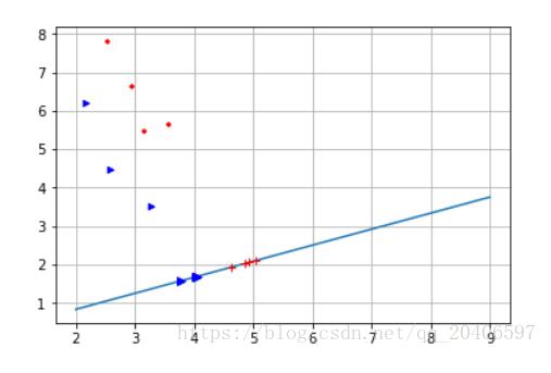#计算第一类样本在直线上的投影点 xi=[] yi=[] for i in range(0,p): y0=X1[i,1] x0=X1[i,0] x1=(k*(y0-b)+x0)/(k**2+1) y1=k*x1+b xi.append(x1) yi.append(y1) print(xi) print(yi) #计算第二类样本在直线上的投影点 xj=[] yj=[] for i in range(0,q): y0=X2[i,1] x0=X2[i,0] x1=(k*(y0-b)+x0)/(k**2+1) y1=k*x1+b xj.append(x1) yj.append(y1) print(xj) print(yj) #画出投影后的点 plt.plot(x,yy) plt.scatter(X1[:,0],X1[:,1],marker='+',color='r',s=20) plt.scatter(X2[:,0],X2[:,1],marker='>',color='b',s=20) plt.grid() plt.plot(xi,yi,'r+') plt.plot(xj,yj,'b>') plt.show()