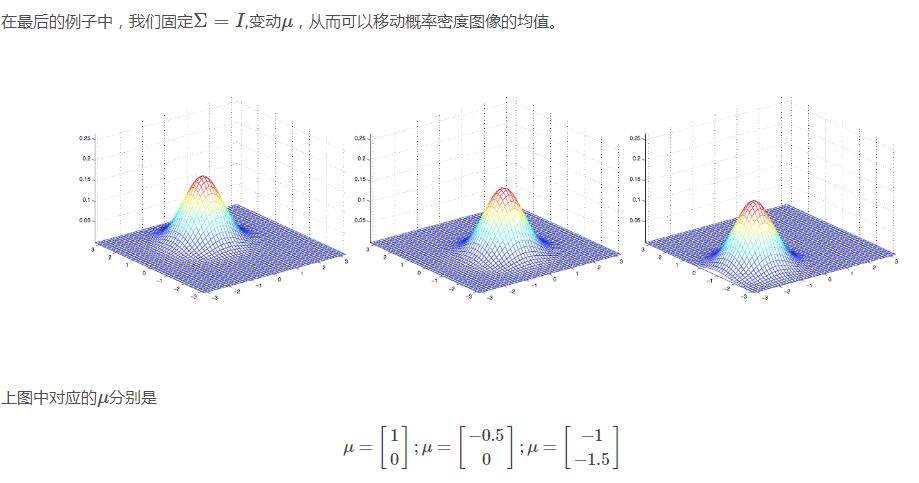最右边的图像展现的二维高斯分布的均值是零向量(2x1的零向量),协方差矩阵Σ=IΣ=I(2x2的单位矩阵),像这样以零向量为均值以单位阵为协方差的多维高斯分布称为标准正态分布,中间的图像以零向量为均值,Σ=0.6IΣ=0.6I;最右边的图像中Σ=2IΣ=2I,观察发现当ΣΣ越大时,高斯分布越“铺开”,当ΣΣ越小时,高斯分布越“收缩”。