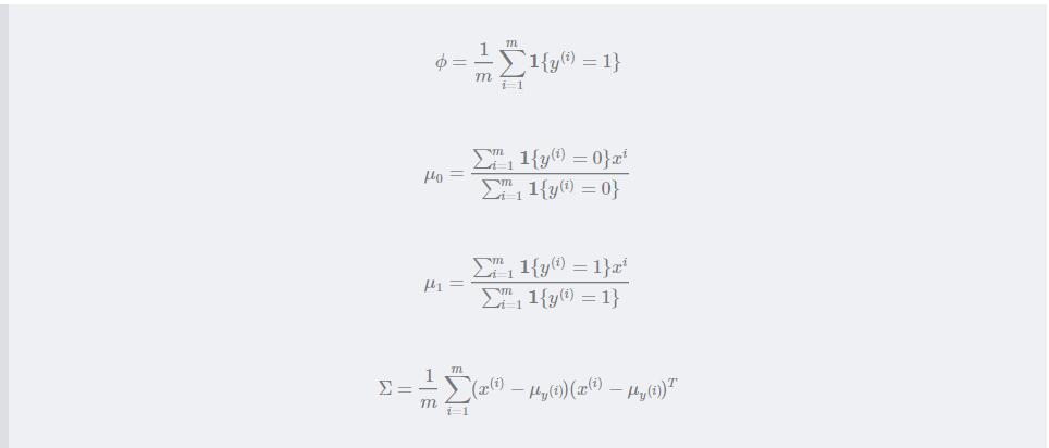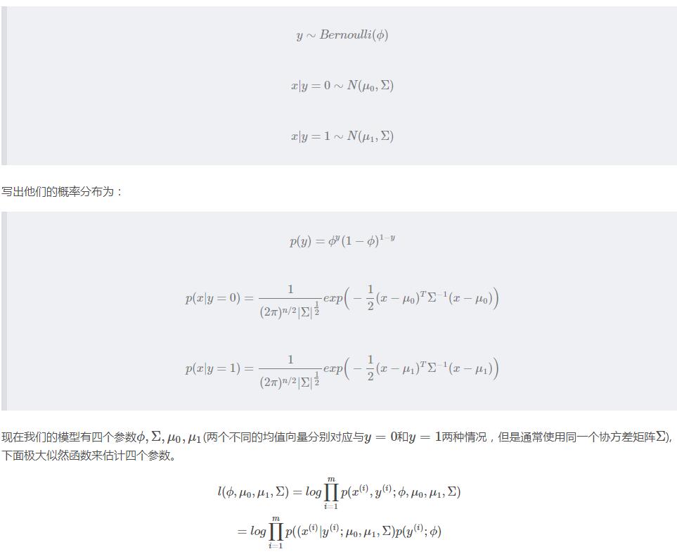 当我们处理输入特征是连续随机变量xx时的分类问题时,我们可以使用高斯判别分析模型(GDA),用多元正态分布模型来描述p(x|y)p(x|y),模型的具体数学表达式是这样的: