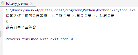 # 判断会员等级中奖率过滤 # 会员等级 1.白银会员 2.黄金会员 3. 钻石会员 def vip_lottery(level): rate = random.randint(1, 10) # 如果是钻石会员,直接进入抽奖函数 if level == 3: return lottery() # 如果是黄金会员, 50% 概率进入抽奖函数 elif level == 2: if rate <= 5: return lottery() else: return 0 # 如果是白银会员, 20% 概率进入抽奖函数 elif level == 1: if rate <= 2: return lottery() else: return 0 # 如果是其他,直接返回未中奖 else: return 0