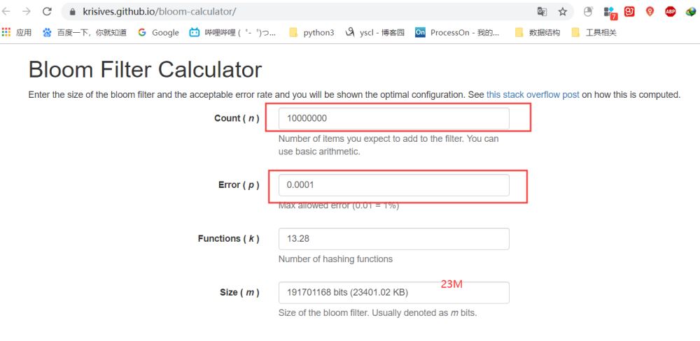 如果想要布隆过滤器知道具体的耗费内存大小以及对应的错误率的信息, 可以使用查看这个布隆过滤器计算器计算出最后的结果。就如下面所示, 1kw数据, 误差为0.01%, 只需要23M内存。