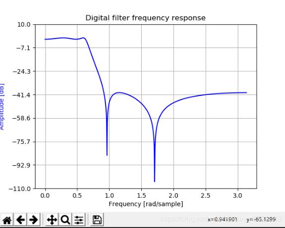 ax1.plot(w, 20 * np.log10(abs(h)), 'b')