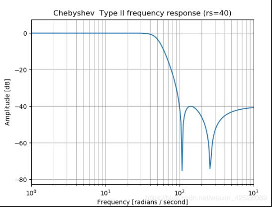 plt.title('Chebyshev Type II frequency response (rs=40)')