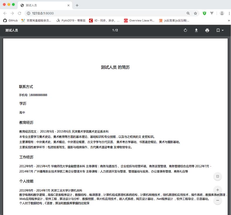 这个demo实现了通过用户输入自己的个人信息生成一份简历pdf,来阐述如何使用Django的HttpResponse生成PDF的文档。