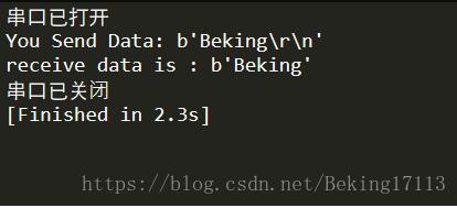 运行结果为下图,发送的数据为 b'Beking\r\n' 接收数据为 b'Beking' .( 在正点原子的数据接受数据中要有\r\n字符,否则会接收不到(可以在代码中更改))