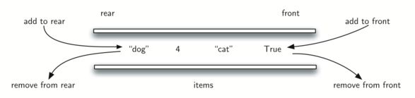 dq = Deque() dq.append(1) dq.append(2) print(list(dq)) # [1, 2] dq.appendleft(0) print(list(dq)) # [0, 1, 2] dq.pop() print(list(dq)) # [0, 1] dq.popleft() print(list(dq)) # [1] dq.pop() print(len(dq)) # 0