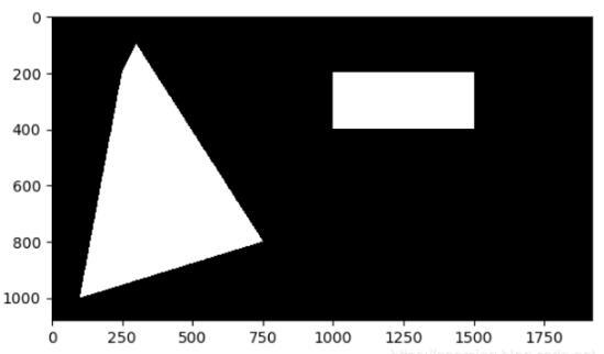 img = np.zeros((1080, 1920, 3), np.uint8) area1 = np.array([[250, 200], [300, 100], [750, 800], [100, 1000]]) area2 = np.array([[1000, 200], [1500, 200], [1500, 400], [1000, 400]]) cv2.fillPoly(img, [area1, area2], (255, 255, 255)) plt.imshow(img) plt.show()