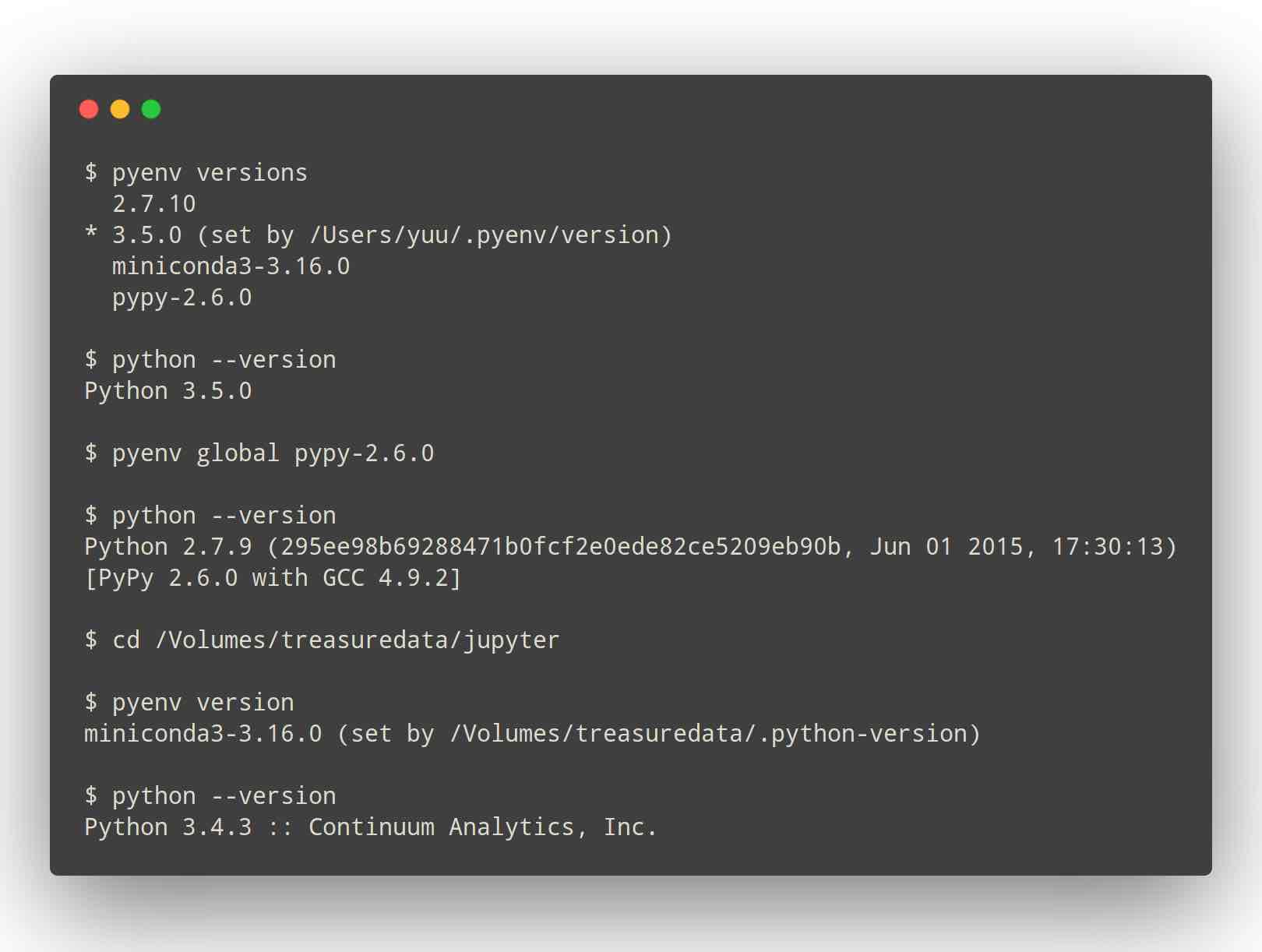 pyenv install --list # 查看可安装的python版本 pyenv versions # 查看已经安装的版本 pyenv install 3.5.0 # 安装 python3.5.0 pyenv uninstall # 卸载