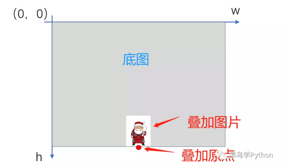对一幅图片而言,坐标原点是在左上角(下图所示)。此外,为了保证最终得到动图的效果,不能简单的将图片以坐标原点为基准进行叠加,比较好的办法是把叠加原点设在底图下边缘的中心位置。