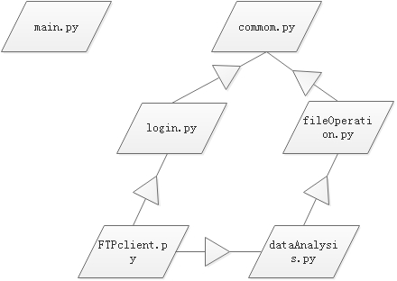 bin:程序入口,程序启动文件main.py用于建立socket连接,然后调用FTPclient.py模块下的run_ftp_client方法运行程序。