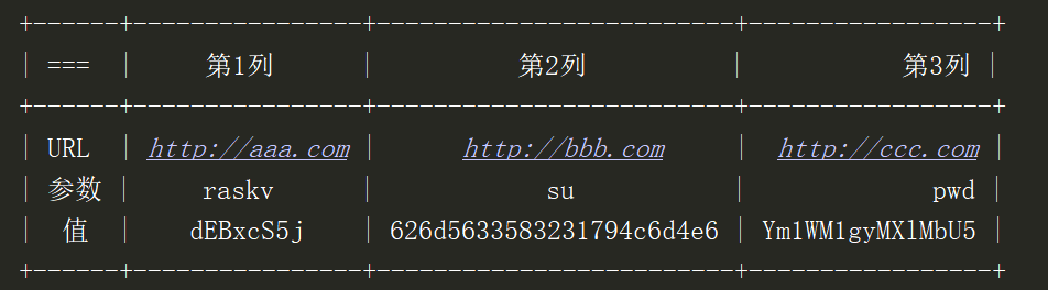 from prettytable import PrettyTable # 默认表头:Field 1、Field 2... # 添加表头 table = PrettyTable(["URL", "参数", "值"]) # add_row 添加一行数据 table.add_row(["http://aaa.com", "raskv", "dEBxcS5j"]) table.add_row(["http://bbb.com", "su", "626d5633583231794c6d4e6"]) table.add_row(["http://ccc.com", "pwd", "Ym1WM1gyMXlMbU5"]) # 默认居中对齐 # 设置"值"列,局左对齐 left首字母 table.align["值"] = 'l' print(table)