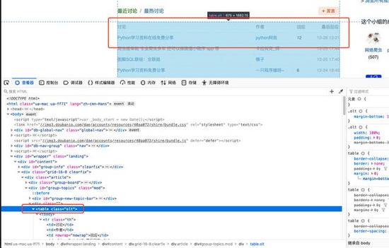 让我们用浏览器开发者工具看看HTML代码,定位到想要的内容上,我们想要把讨论组里的帖子标题和链接都给扒出来。