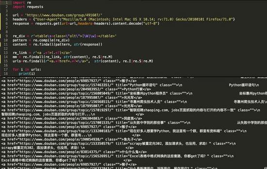 rl = 'https://www.douban.com/group/491607/'headers = {"User-Agent":"Mozilla/5.0 (Macintosh; Intel Mac OS X 10.14; rv:71.0) Gecko/20100101 Firefox/71.0"}response = requests.get(url=url,headers=headers).content.decode('utf-8')