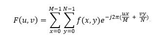 图像(MxN)的二维离散傅立叶变换可以将图像由空间域变换到频域中去,空间域中用x,y来表示空间坐标,频域由u,v来表示频率,二维离散傅立叶变换的公式如下: