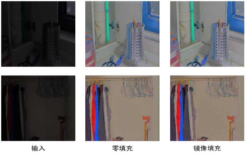 以低光照增强任务为例,最终对比效果如下图。零填充会产生边缘伪影,而镜像填充很好地缓解了这一效应。