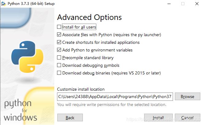 勾选Add Python 3.7 to PATH,方便在cmd命令行中调用,然后选择Customize installation。