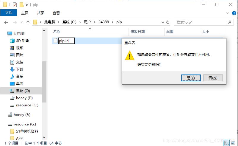 在pip文件夹下创建一个txt文件,更名为pip.ini,提示如图,点击确定。