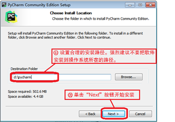(2)在软件安装路径设置界面,设置合理的安装路径。强烈建议不要把软件安装到操作系统所在的路径,否则出现操作系统崩溃等特殊情况,必须重做操作系统时,PyCharm程序路径下的程序将被破坏。PyCharm默认的安装路径为操作系统所在的路径,建议更改,另外安装路径中建议不要使用中文字符。笔者选择的安装路径为“D:\PyCharm”,如图6所示。单击“Next”按钮,进入创建快捷方式界面。