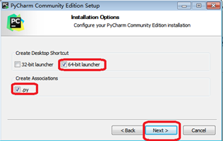 (3)在创建桌面快捷方式界面(Create Desktop Shortcut)中设置PyCharm程序的快捷方式。如果计算机操作系统是32位,选择“32-bit launcher”,否则选择“64-bit launcher”。这里的计算机操作系统是64位系统,所以选择“64-bit launcher”;接下来设置关联文件(Create Associations),勾选.py左侧的复选框,这样以后再打开.py(.py文件是python脚本文件,接下来我们编写的很多程序都是.py的)文件时,会默认调用PyCharm打开,如图7所示。