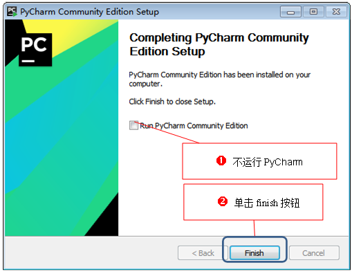 (5)安装完成后,单击Finish按钮,结束安装,如图9所示。也可以选中“Run PyCharm Community Edition”前面的单选框,单击Finish按钮,这样可以直接运行PyCharm开发环境。