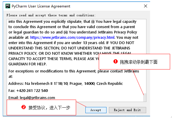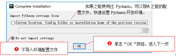 (1)单击Pycharm桌面快捷方式,启动PyCharm程序。选择是否导入开发环境配置文件,这里选择不导入,单击OK按钮,进入阅读协议页,如图12所示。