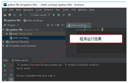 前面的步骤已经启动了PyCharm开发环境,接下来使用该环境编写hello world程序,步骤如下:
