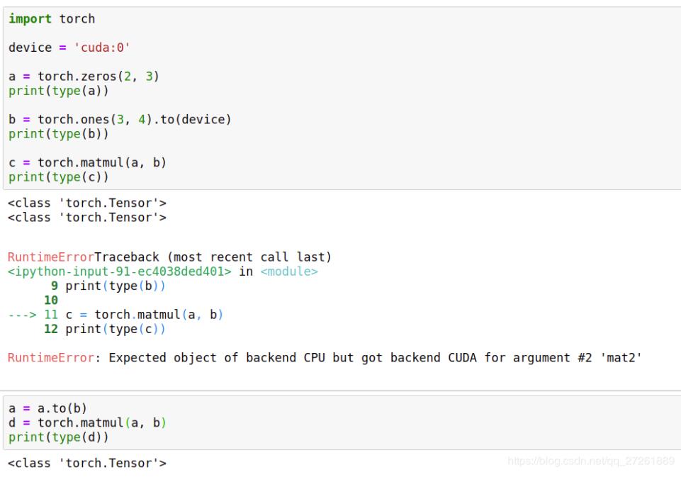 import torch device = 'cuda:0' a = torch.zeros(2, 3) print(type(a)) b = torch.ones(3, 4).to(device) print(type(b)) c = torch.matmul(a, b) print(type(c))