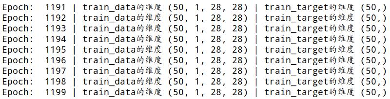 Step: 1186 | train_data的维度 (50, 1, 20, 20) | train_target的维度 (50,) Step: 1187 | train_data的维度 (50, 1, 20, 20) | train_target的维度 (50,) Step: 1188 | train_data的维度 (50, 1, 20, 20) | train_target的维度 (50,) Step: 1189 | train_data的维度 (50, 1, 20, 20) | train_target的维度 (50,) Step: 1190 | train_data的维度 (50, 1, 20, 20) | train_target的维度 (50,) Step: 1191 | train_data的维度 (50, 1, 20, 20) | train_target的维度 (50,) Step: 1192 | train_data的维度 (50, 1, 20, 20) | train_target的维度 (50,) Step: 1193 | train_data的维度 (50, 1, 20, 20) | train_target的维度 (50,) Step: 1194 | train_data的维度 (50, 1, 20, 20) | train_target的维度 (50,) Step: 1195 | train_data的维度 (50, 1, 20, 20) | train_target的维度 (50,) Step: 1196 | train_data的维度 (50, 1, 20, 20) | train_target的维度 (50,) Step: 1197 | train_data的维度 (50, 1, 20, 20) | train_target的维度 (50,) Step: 1198 | train_data的维度 (50, 1, 20, 20) | train_target的维度 (50,) Step: 1199 | train_data的维度 (50, 1, 20, 20) | train_target的维度 (50,)