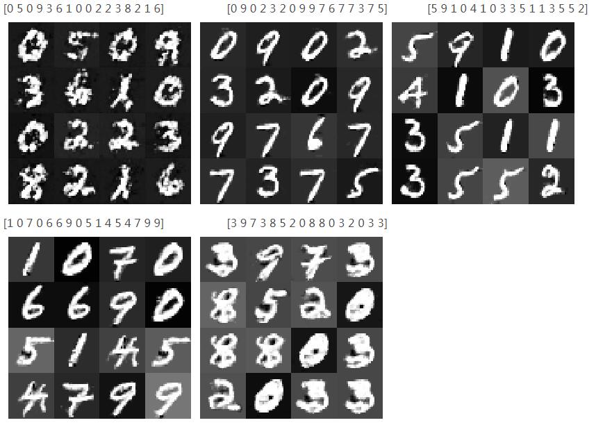 在训练的过程中保存了训练好的模型,根据输出图片的清晰度,用清晰度较高的模型,使用随机向量和10维类标签来指定生成的数字。
