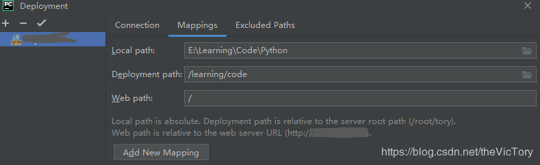 如果希望实现项目同步可以定义对话框的第二个标签页Mappings,将本地的项目目录映射到服务器的指定目录