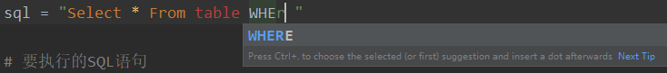 更为方便的地方在于连接到某个指定库之后,当你在python程序中书写SQL语句时,会进行语言检测,按下alt+shift+enter设置当前项目的数据库为Mysql,代码会自动提示补全数据库中的关键字、表名、字段名