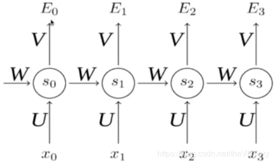 卷积网络的输入只有输入数据X,而循环神经网络除了输入数据X之外,每一步的输出会作为下一步的输入,如此循环,并且每一次采用相同的激活函数和参数。在每次循环中,x0乘以系数U得到s0,再经过系数W输入到下一次,以此循环构成循环神经网络的正向传播。