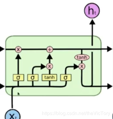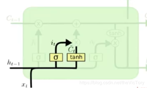 如下中图所示为传入门结构,ht-1和xt在经过遗忘门的结果it和tanh的结果Ct作点积运算得到本次运算的输入