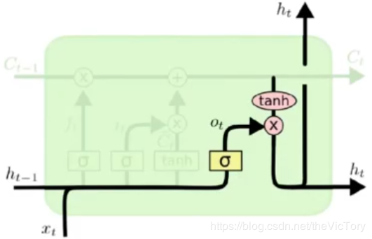 如下右图所示为输出门结构,ht-1和xt经过遗忘门的结果ot与当状态作点积产生本次的输出